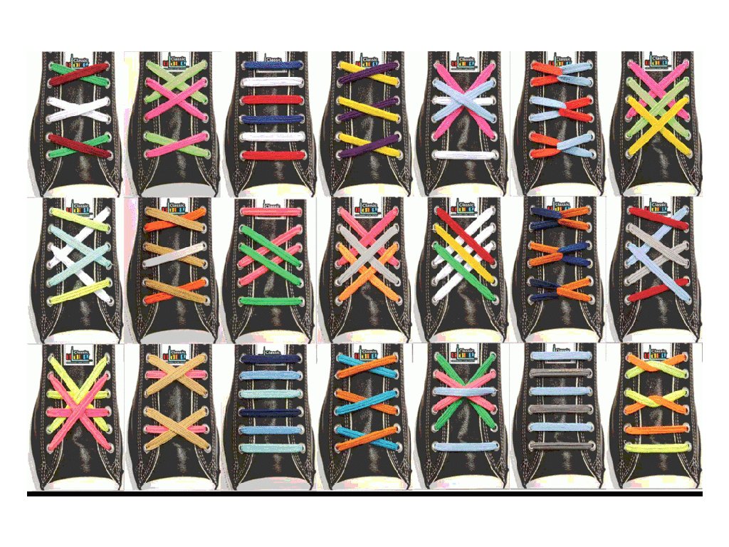 Najčastejšie to je 5-8 párov dierok. Šnúrky je možné ľubovoľne kombinovať vo farbách, ak ich zakúpite viac. Tieto šnúrky sú veľmi obľúbeným módnym doplnkom každého, kto chce vyniknúť v dave.